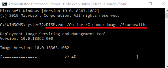 - Wait until the tool completes the scan of your computer (i.e. when the progress bar gets to 100%) before you proceed to the next step. * Paste the command below in the console and press **Enter** on your keyboard. ***DISM.exe /Online /Cleanup-image /Checkhealth*** Again, wait till the progress bar gets to 100% and proceed to the next step. * Paste this command in the console and press **Enter**. ***DISM.exe /Online /Cleanup-image /Restorehealth***