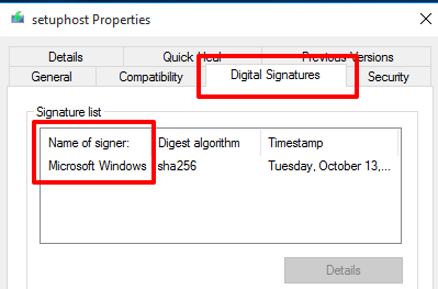 - Go to the Details tab and check the setuphost Copyright belongs to **ⓒ**Microsoft Corporation.