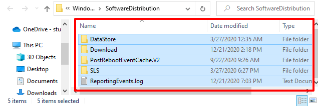 - Select all the content of the SoftwareDistribution folder and delete them. Better yet, back up the content in another folder on your computer.