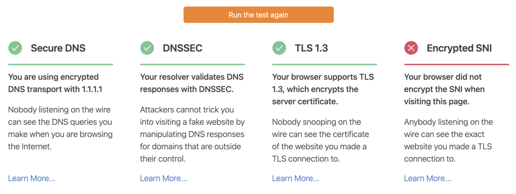 As you can see, the test was unable to detect Secure DNS. You can fix this by using a different secure DNS server or contacting your internet service provider. Once I enabled Google Chrome Secure DNS through CloudFlare, I was able to get a green check.