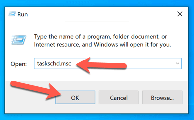- In the **Run** dialog box, type **taskschd.msc**, then select **OK** to run it.