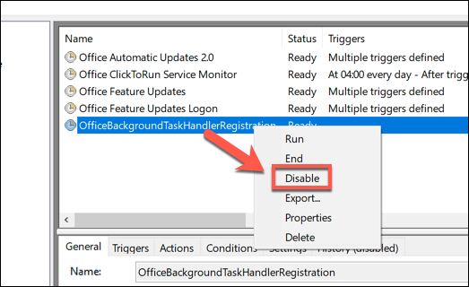 - Once hidden tasks are visible, search through the categories to find these entries (For example, **OfficeBackgroundTaskHandlerRegistration **can be found in the **Task Scheduler Library > Microsoft > Office **folder). To disable it, right-click the task and select the **Disable **option.