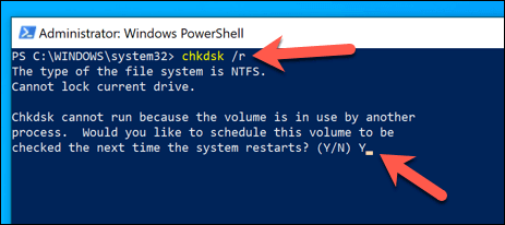 - After you run SFC, type **chkdsk /r **and hit enter. This will run the **Check Disk utility** to scan for (and fix) potential file system errors that could prevent Windows from working correctly. You’ll need to approve a boot level scan by hitting **Y**, then **enter**, to approve the process.
