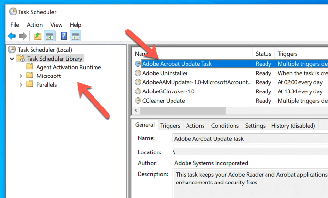 - After a few moments, the **Task Scheduler **window will open. From here, you’ll be able to view a list of scheduled tasks on your PC, used by Microsoft and third-party services and apps. For instance, the **Adobe Acrobat Update Task **is scheduled to run every day and after each sign in. These are separated by categories on the right (For instance, **Microsoft **for tasks scheduled by Windows or Office services).