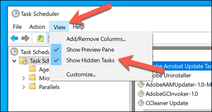 - Some tasks are known to be responsible for common issues, such as taskeng.exe popping up randomly. These include the **User_Feed_Synchronization **and **OfficeBackgroundTaskHandlerRegistration **tasks. To view these, select **View > Show Hidden Tasks **from the menu.