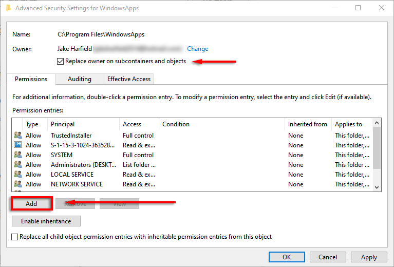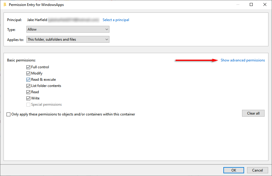 - Repeat steps 6 to 10 to add your user account. * Click Show advanced permissions.