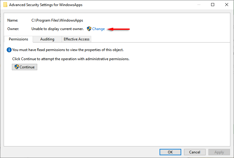 - Where it says “Unable to display current owner,” click Change.