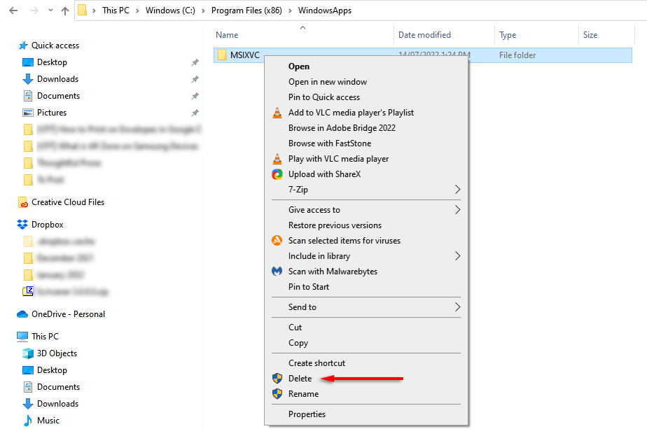 You should now be able to delete the MSIXVC folder as usual by right-clicking the folder and clicking Delete. However, some users report that changing permissions doesn’t enable them to. In that case, try the following method.