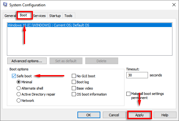- Click the Boot tab and click Safe Boot. Click Apply, then restart your PC.