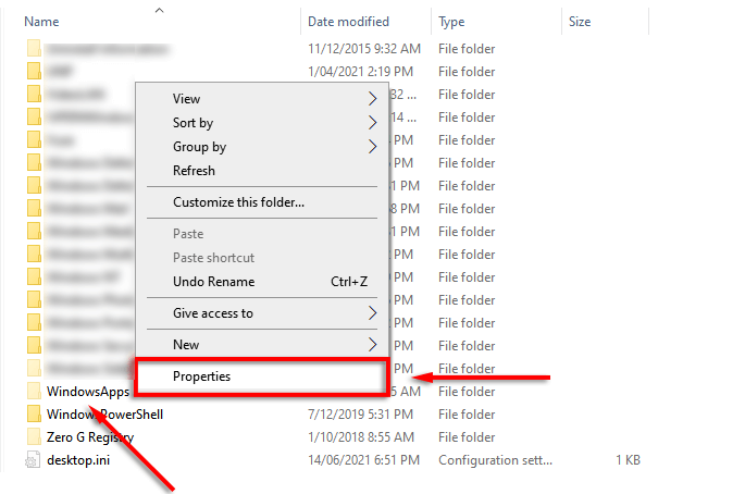- Right-click the WindowsApps folder and select Properties.