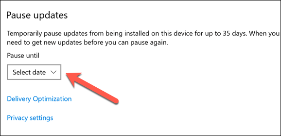 - In the **Advanced Options** menu, select how long you wish to pause all updates using the **Pause Updates **drop-down menu. Any changes you make will apply immediately.