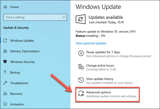 - In the **Settings** menu, select **Update & Security **> **Windows Update** > **Advanced Options**.