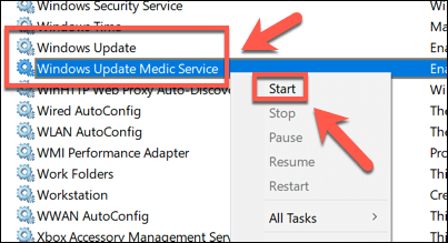 - In the **Services** window, scroll through and locate **Windows Update **and **Windows Update Medic Service**. If these services aren’t running, right-click each service and select **Start**. Otherwise, right-click each service and select **Restart** instead.