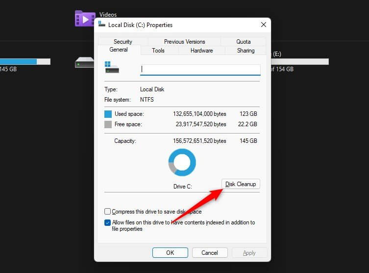 - Select the **Local Disk **and press **Alt + Enter** to open disk properties. * Select the **General** tab and click the **Disk Cleanup** option.