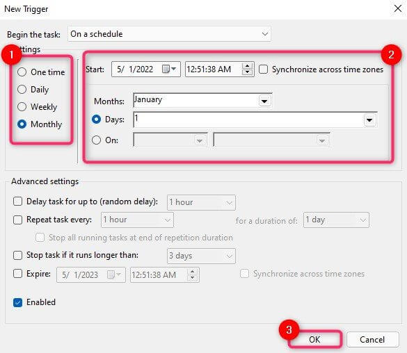 - Select a schedule for the task by selecting the frequency (daily/monthly/weekly) and a time. Click **OK** when done.