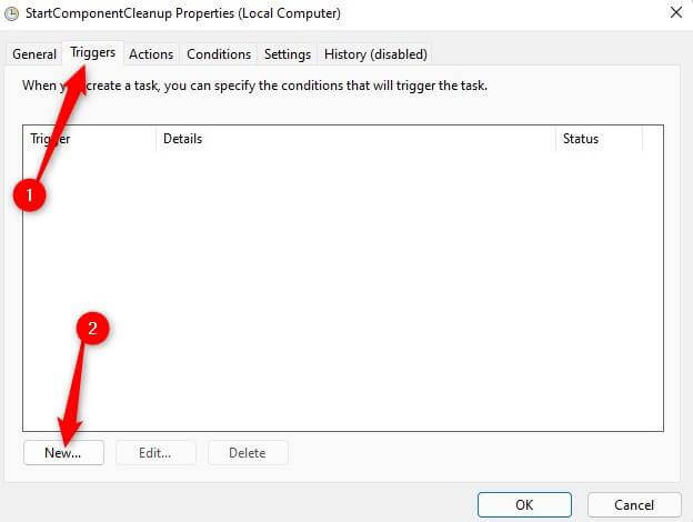 - Right-click on the **StartComponentCleanup **task from the task list, select **Properties**, and switch to the **Triggers **tab in properties. Then, click on **New**.