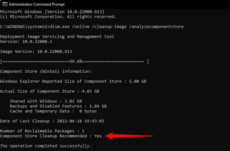 - Once the process completes, check if it says Yes or No next to Component Store Cleanup Recommended.