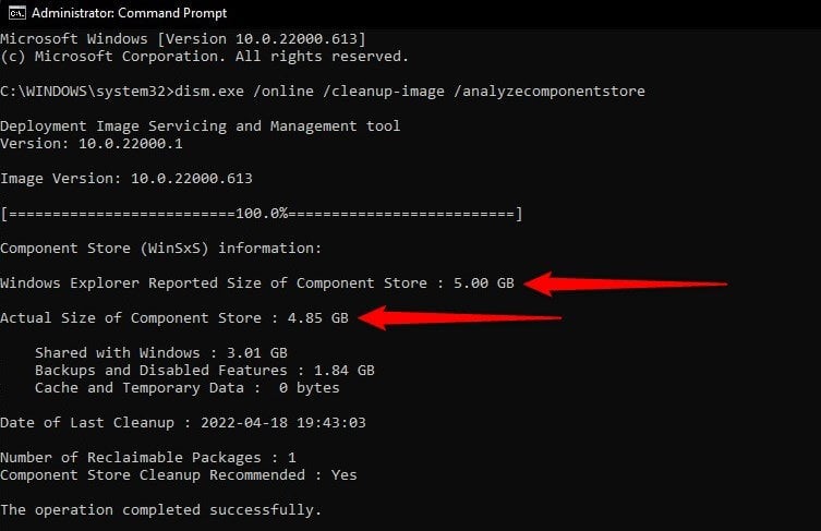 DISM (Deployment Image Servicing and Management) is a command-line utility with a built-in option for cleaning up the component store. A cleanup using DISM will remove all the unnecessary files from the WinSxS directory without disrupting your system’s functioning.