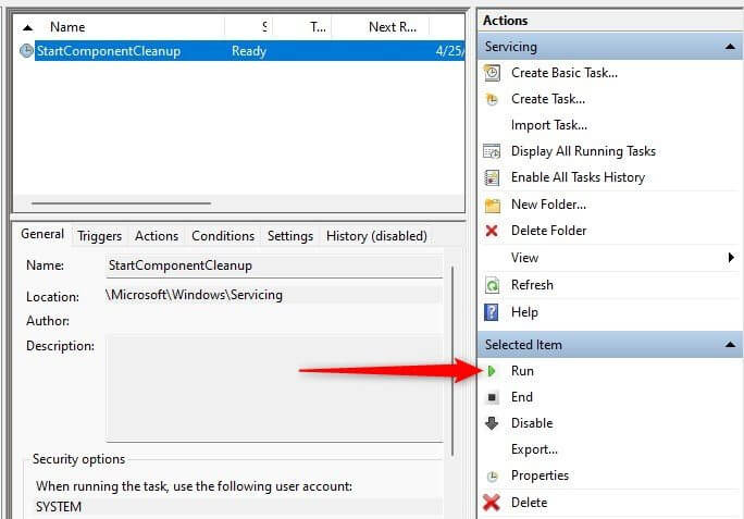 - The task will run automatically as per the schedule you’ve added. However, you can also run the task right away by selecting the StartComponentCleanup task and selecting **Run** from the right sidebar.