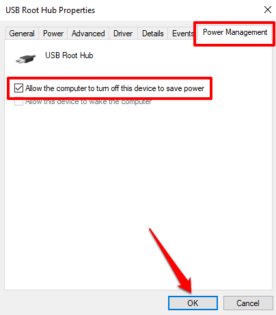 - Finally, select OK to save the setting. Repeat these steps for all relevant USB drivers on your computer.