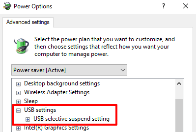 Note that the USB selective suspend configuration is unique to your current/preferred power plan. If you switch plans (say from “Balanced” to “Power saver”), you’ll need to repeat these steps and disable USB selective suspend for the new battery plan.