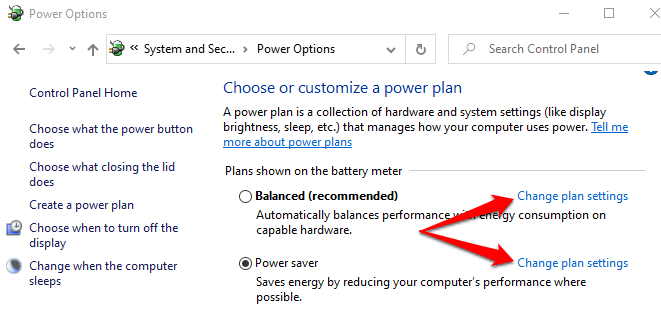 - Select the Change plan settings option next to your current power plan — Balanced or Power Saver or High Performance.