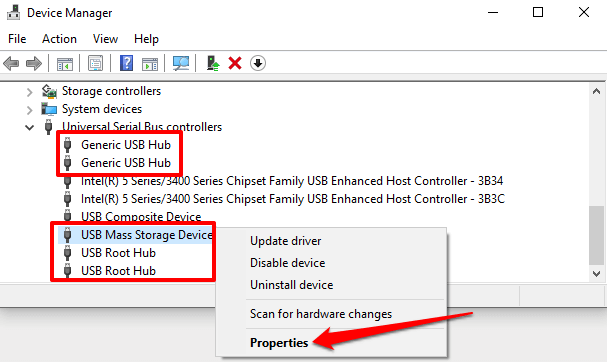 - Expand the Universal Serial Bus controllers section, right-click any of the “Generic USB Hub” or “USB Root Hub” drivers, and select Properties.