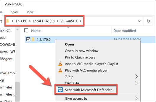 - To do this, you’ll need to open a new File Explorer window and right-click the directory containing the VulkanRT source files. If you’re running Microsoft Defender, select **Scan with Microsoft Defender **from the options menu, or select a similar option for your third-party antivirus provider.