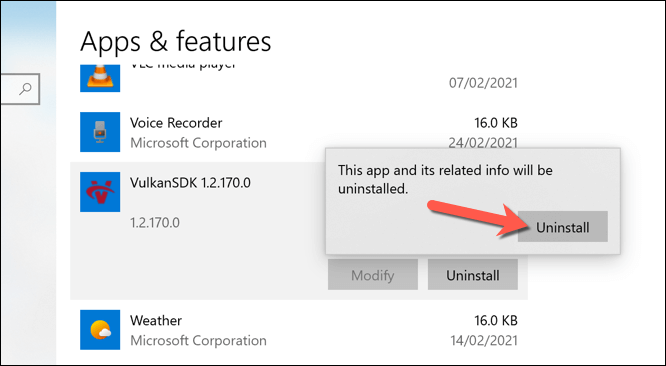 Like any other third-party software installed on your PC, VulkanRT (or the Vulkan SDK) can be removed using the Windows Settings menu. Removing VulkanRT from your PC will prevent any games or applications that require it from working, however, and you’ll need to reinstall it afterwards using the steps above.