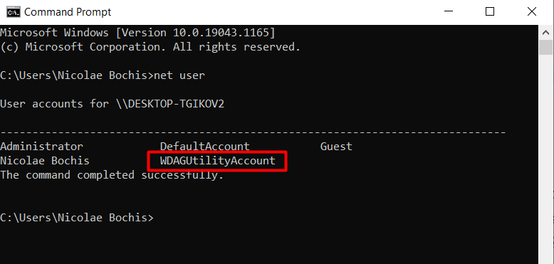 WDAGUtilityAccount is a built-in user account. It’s part of Windows Defender Application Guard (WDAG), which has been part of Windows 10 since version 1709. Usually, Application Guard is disabled by default. You can find it by opening the Command Prompt and typing the net user command.