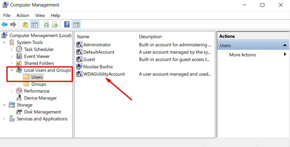 In the right panel of the app, go to System Tools > Local Users and Groups and click on the Users folder. That’s where you’re going to find the WDAGUtilityAccount user account.