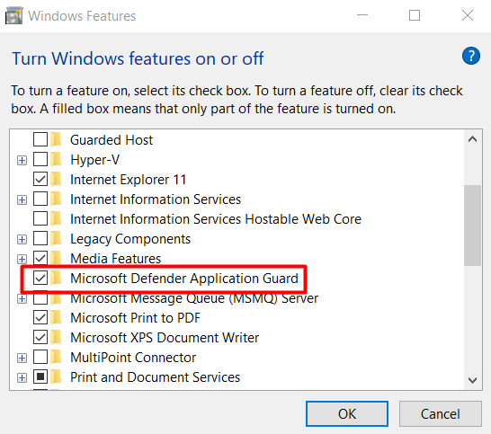 - Scroll through the list of features until you find Microsoft Defender Application Guard and check the box next to it.
