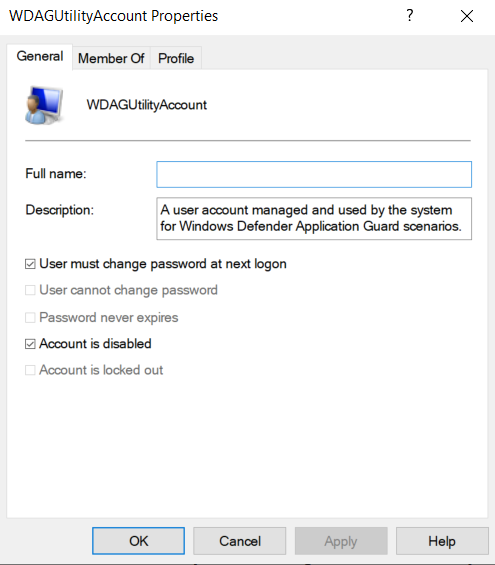 Go back to the Computer Management tool and double-click on the WDAGUtilityAccount user account. A window with various settings will open.