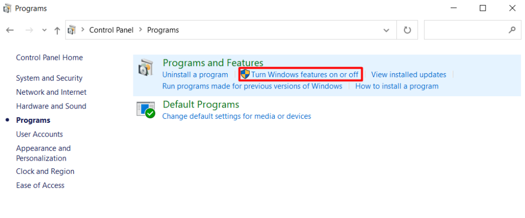 - Go to Control Panel > Programs > Programs and Features and click on Turn Windows features on or off.