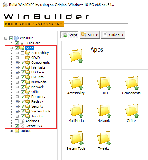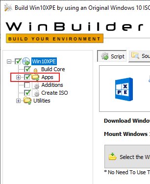 - Once the Windows 10 installation files have been loaded into Win10XPE, you can begin customizing the tools you want to include with your WinPE disk. In the left-hand menu, click the + arrow next to Apps to expand that section.