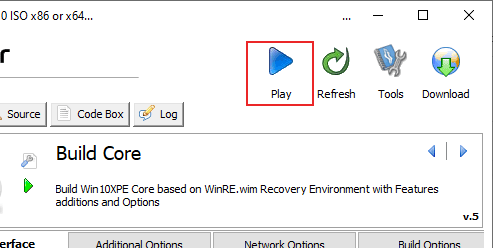 - Once your Win10XPE configuration is ready and your files are in place, you can build it. Click the Play button in the top-right to begin the build process.