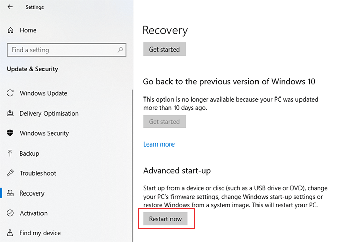 - From here, click **Update & Security > Recovery > Restart now. **This will boot your PC into your Windows 10 advanced boot menu.