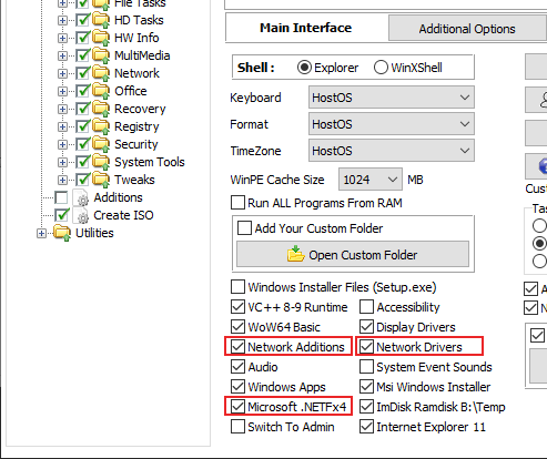 - The default Build Core menu configuration should work for most users. If you want to use a wireless network connection in WinPE, however, be sure to enable the **Network Drivers, Network Additions **and **Microsoft .NETFx4 **checkboxes in the Main Interface tab.