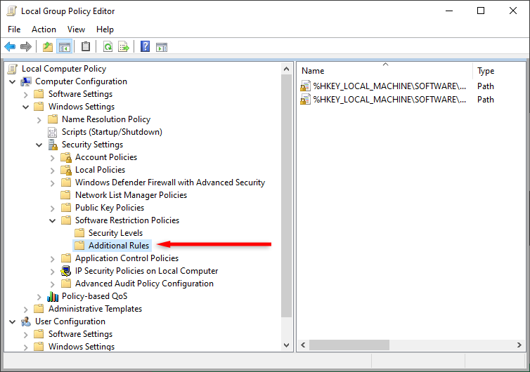 - Navigate to Computer Configuration > Windows Settings > Security Settings > Software Restriction Policies > Additional Rules by double-clicking each entry.