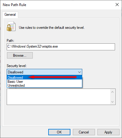 - In the next window, press Browse. Navigate to C:WindowsSystem32wisptis.exe and select Okay. * Back in the New Path Rule window, click the drop-down menu under “Security level” and select Disallowed.