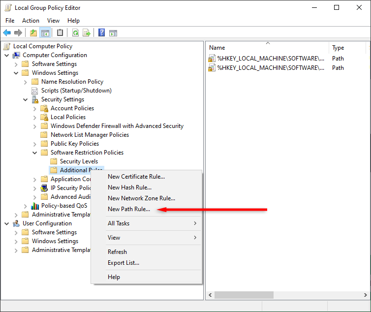 - Right-click Additional Rules and select New Path Rule.