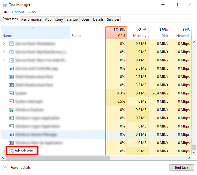 - Reboot your computer and check that the wisptis.exe process no longer appears in the Task Manager. To open Task Manager, click Ctrl + Shift + Esc, then navigate to the Processes tab.