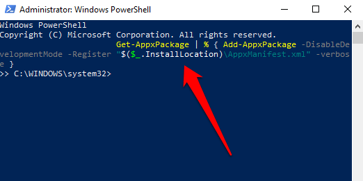 Get-AppxPackage | % { Add-AppxPackage -DisableDevelopmentMode -Register “$($_.InstallLocation)AppxManifest.xml” -verbose }