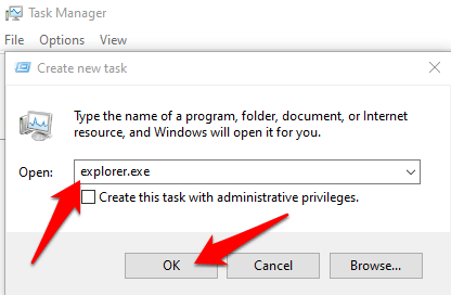 - Type **explorer.exe**, click **OK** to restart **Windows Explorer**, and exit the Task Manager.