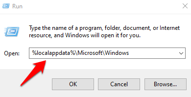 - Right-click Start > Run and type localappdata%MicrosoftWindows.