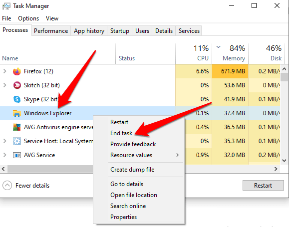 - Right-click **explorer.exe** or **Windows Explorer** and select **End Task**.