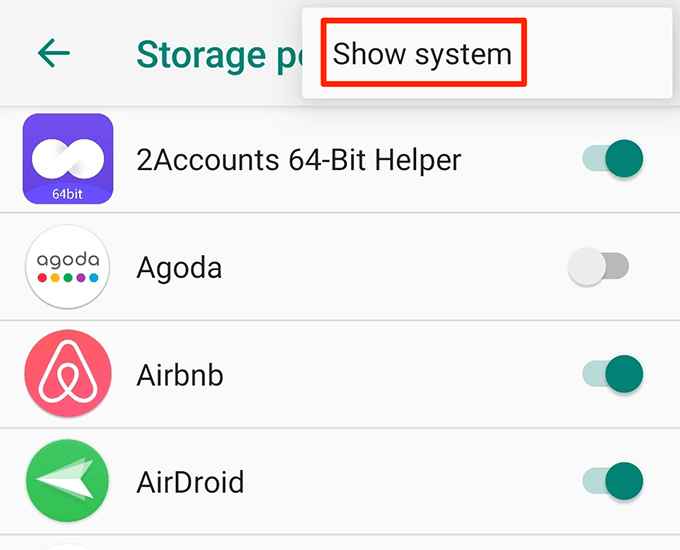 - By default, you won’t see the system storage options where the item you need is located. To enable these options, tap the three-dots at the top-right corner and select **Show system**.