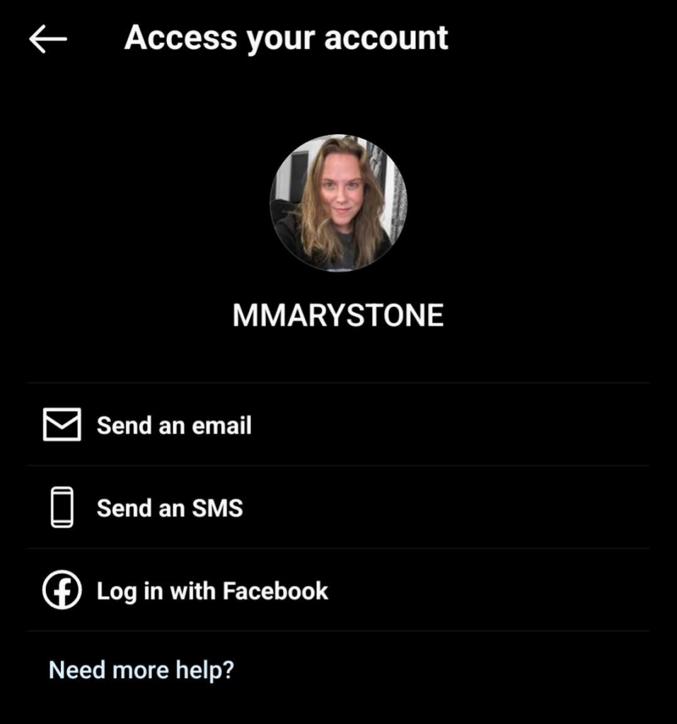 - Choose how you want Instagram to help. Instagram can send you an email with a link to get back into your account or an SMS text message with a confirmation code. There’s also a link on this screen to log in with Facebook.
