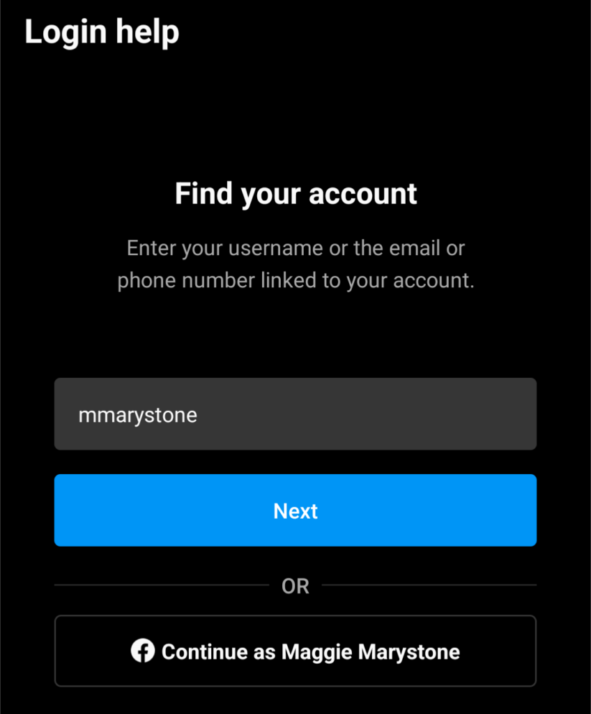 - Select the **Get help logging in** link. * On the “Find your account” screen, enter either your username or the email address or phone number linked to your Instagram account. If you can’t remember your Instagram username, ask a friend who follows you on Instagram to take a screenshot of your username and send it to you. Alternatively, you can choose to log in with your Facebook account.