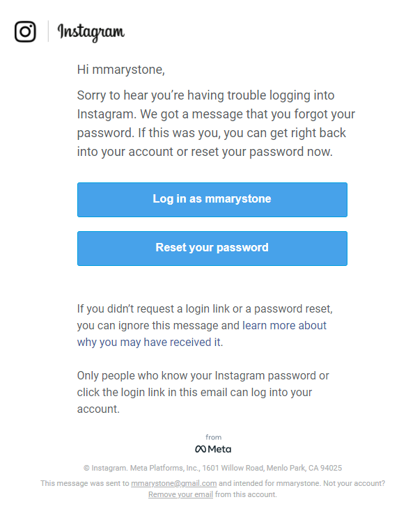 - Check your email account for an email from Instagram. In the email, select the button to **reset your password**.